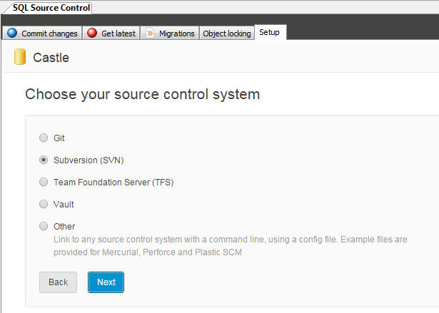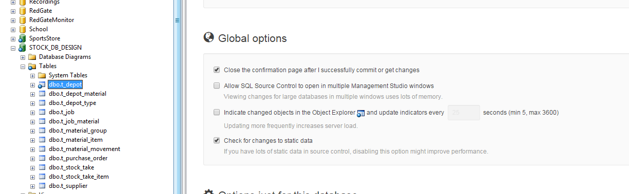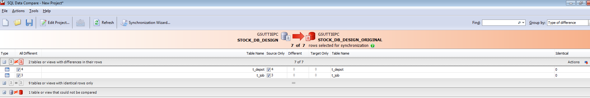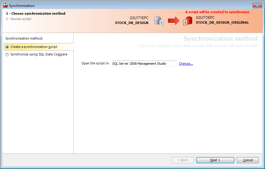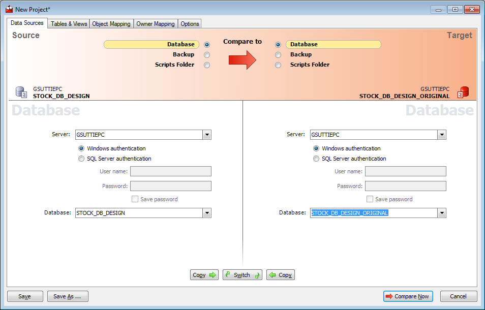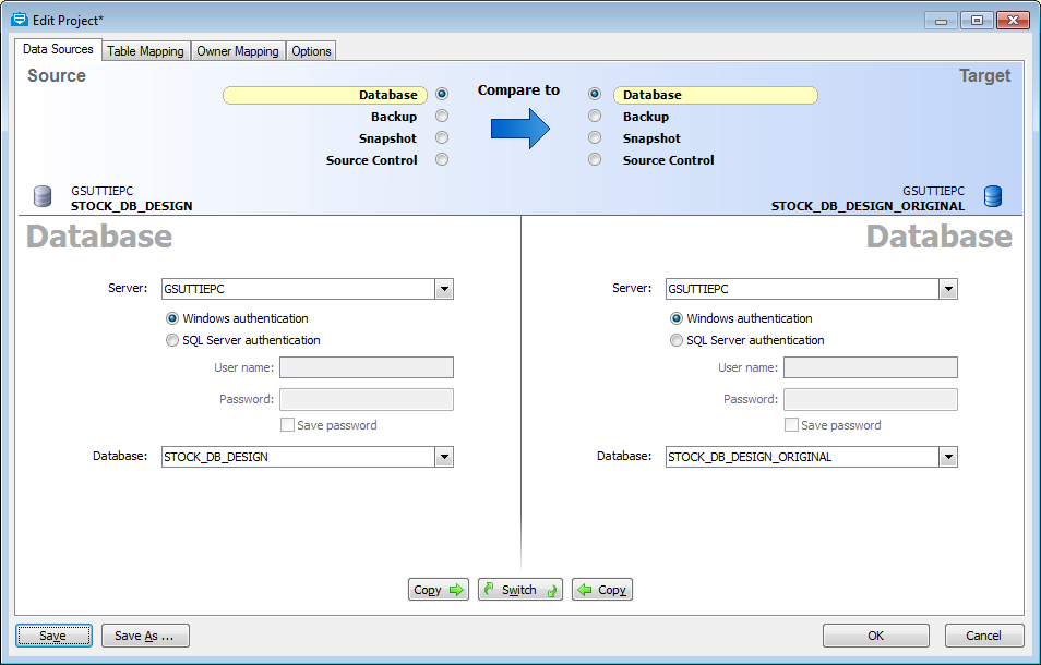 Above I have chosen my Database server and the database I want to use as the source and the target database (one we want to update).